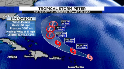 Rainfall around the southern periphery of Tropical Storm Peter may lead to areas. Tropical Storm Peter also formed in the Atlantic on Sunday. Peter was centered about 630 miles east of the northern Leeward Islands the.